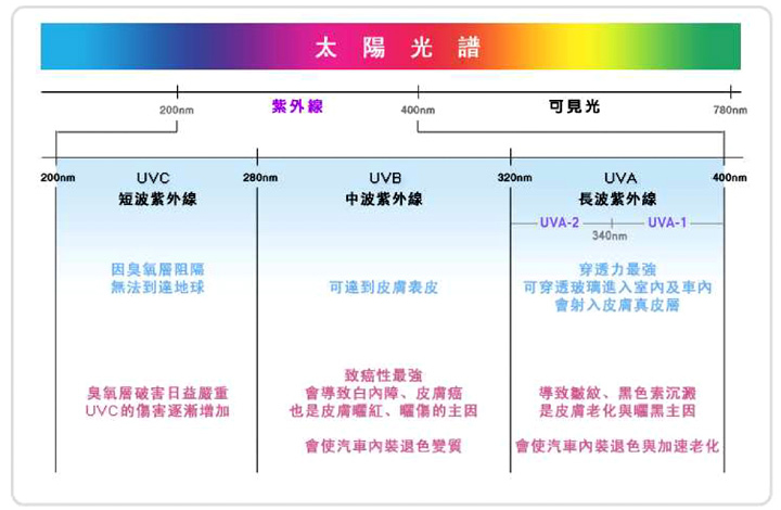 紫外線(Ultraviolet)簡稱UV,指太陽光中波長200至400nm的光線,因波長小於可見光,肉眼是無法看見的,紫外線又依波長可分為短波紫外線(UVC)波長200~280nm、中波紫外線(UVB)波長280~320nm、長波紫外線(UVA)波長320~400nm,但紫外線是傷害性光線的一種,所以各波長對人體的傷害也各有不同,不僅會破壞皮膚內的自由基加速皮膚老化,還會造成塑化、紡織與木材等材料的退色,了解紫外線並有效的作好防護才是對策。