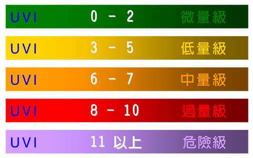 紫外線指數簡稱UVI,為地面上單位面積累積接受的紫外線輻射量(單位為百焦耳/平方公尺),是氣象上常用來表示紫外線照射的安全範圍。當紫外線指數是0到2時,屬微量級,無曝曬時限。3到5屬低量級, 無曝曬時限。6到7屬中量級,曝曬時限為30分鐘。8到10屬過量級,曝曬時限為20分鐘。11以上危險級,曝曬時限為12分鐘。